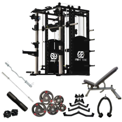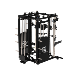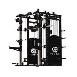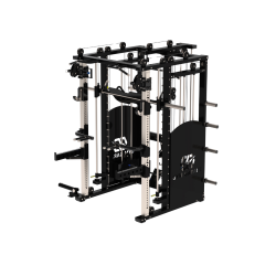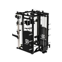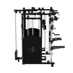 マルチラックとは、1台で複数のトレーニングが可能な多機能マシンです。スミスマシン、ハーフラック、ケーブルプーリーなどが統合されており、全身の筋力トレーニングに対応しています。省スペース設計のため、パーソナルジムやホームジムに最適です。