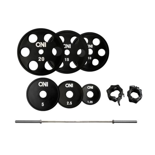 持ちやすいグリップホールディングタイプのプレート、ONIパワーリフティングバー オリンピックシャフトのセットです。