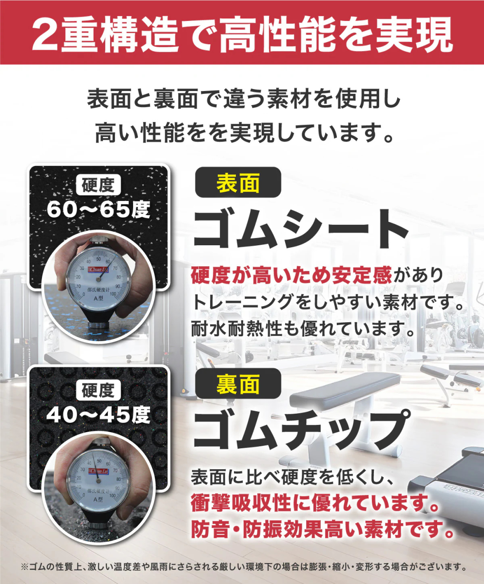 ゴムチップとゴムシートの二層構造のゴムマットです。