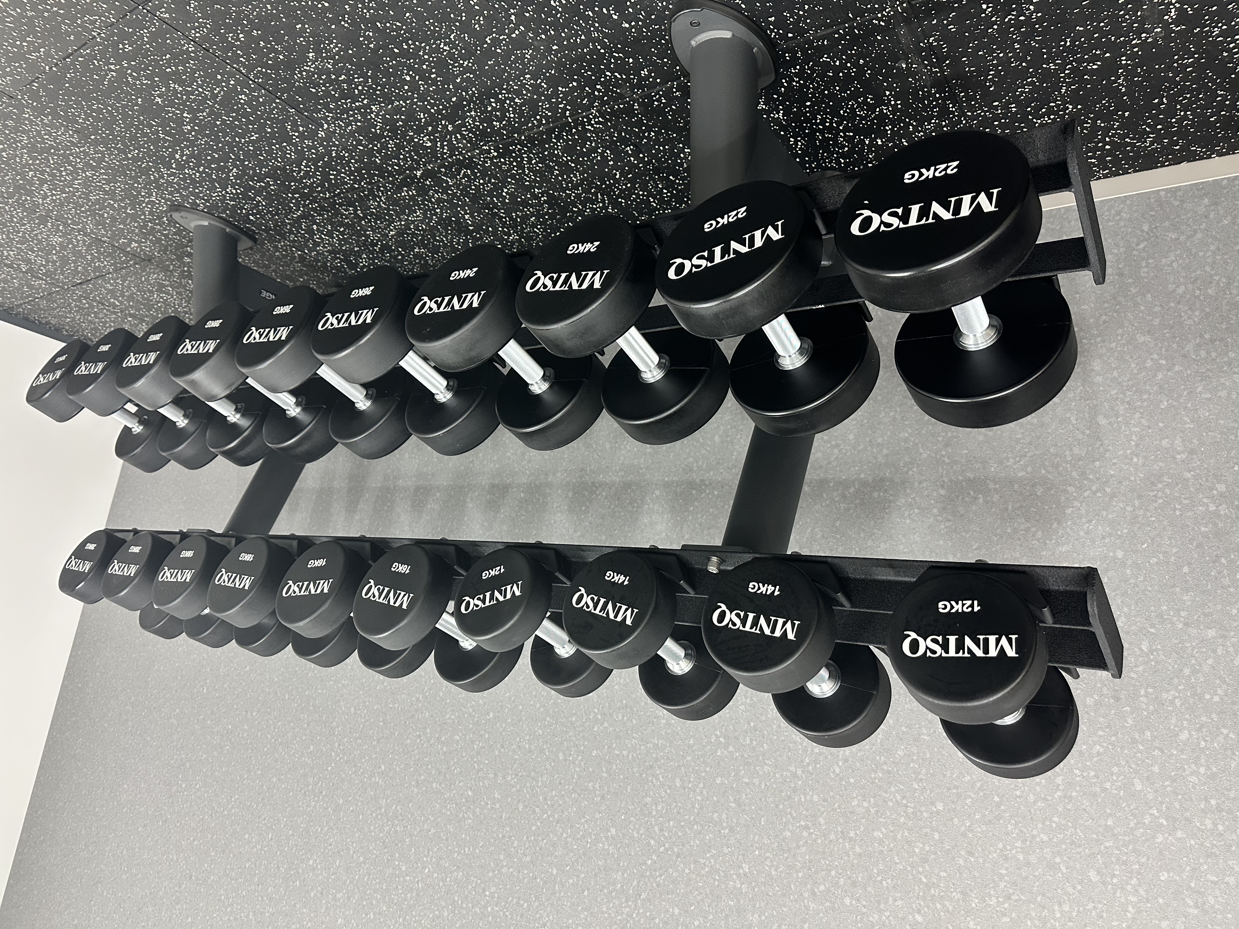 A. 一般的なオフィスの床耐荷重(300kg/㎡程度)であれば、ダンベルや一般的なマシンの設置は問題ありません。高重量を扱うラック等を設置する場合は、重量を分散させる専用のゴムマット(プラットフォーム)を敷くことで対応可能です。現地調査も対応しておりますのでお気軽にご相談ください。