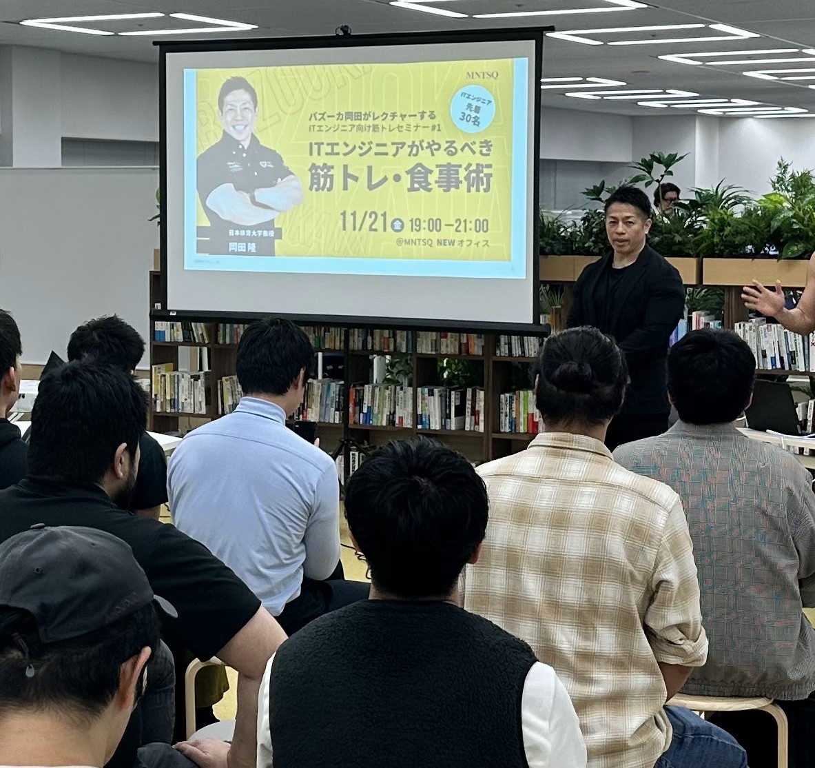 • 結果: 企業ロゴ入りの機材はオフィス空間に馴染み、 「これが社内にあるのは強い…!」と社員からも驚きの声が。 セミナーには30名超が参加し、筋トレ・食事・習慣形成を学ぶことで、 「企業の生産性向上=社員の健康づくり」という文化が定着しています。